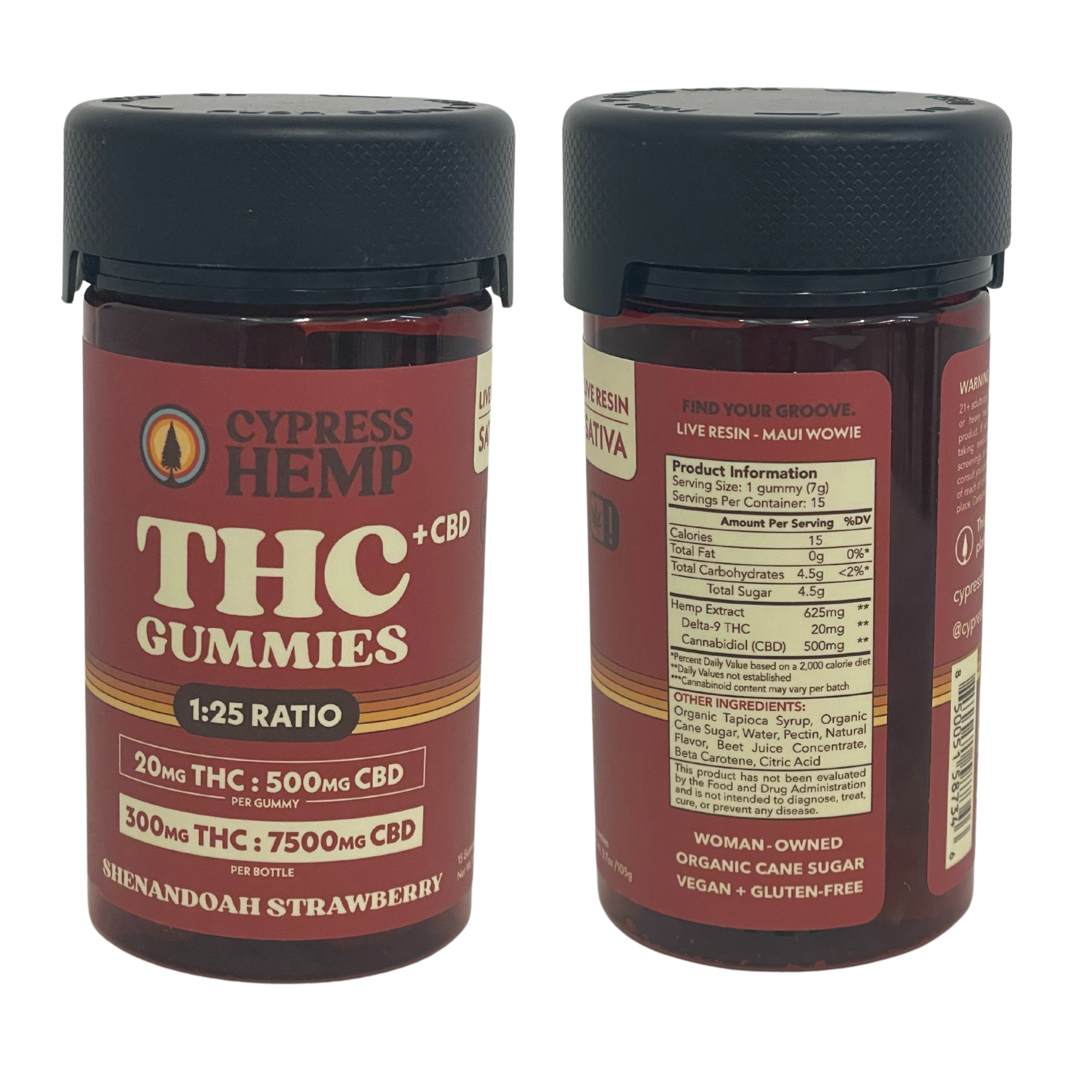 - 20mg THC & 500mg CBD per gummy (300mg THC & 7500mg CBD per bottle)